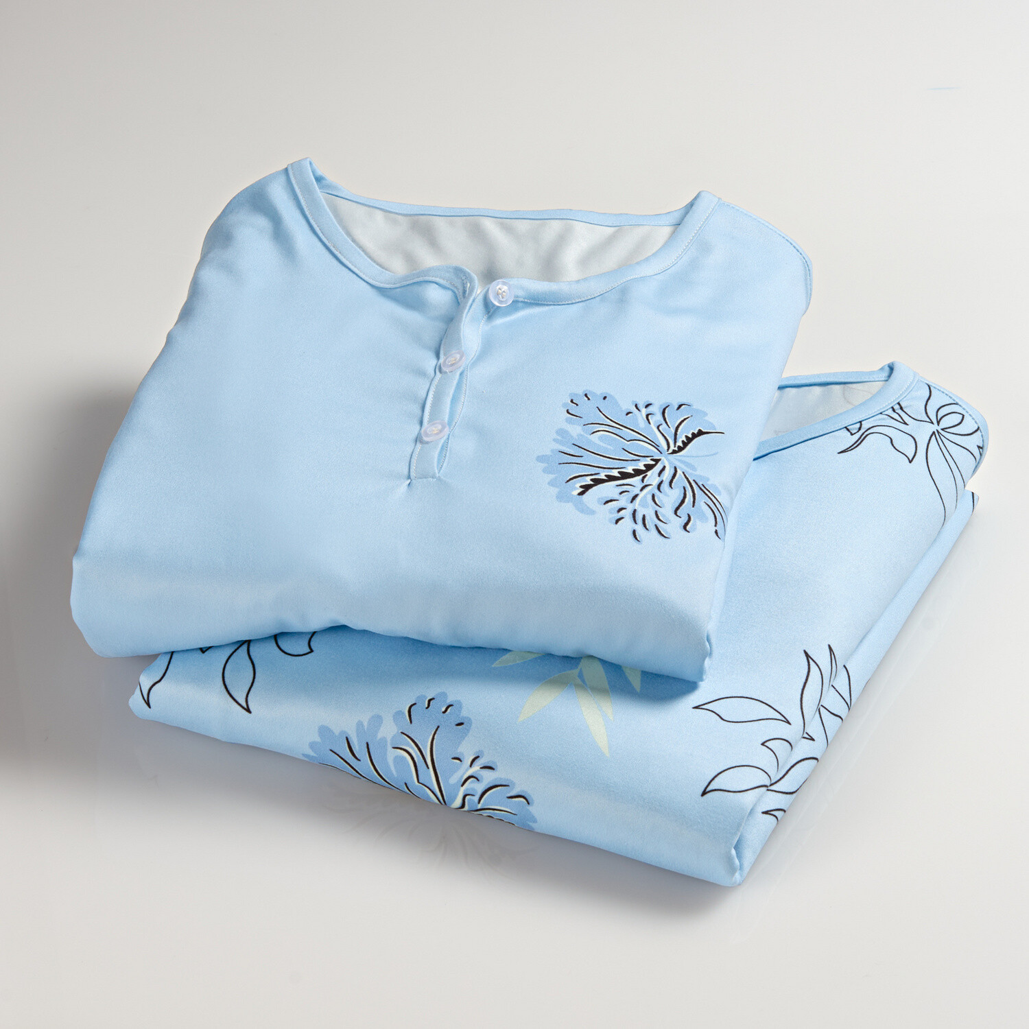 Dvě noční košile z jemného žerzeje: jednobarevná nebesky modrá a s květinovým potiskem. Jednobarevná + květinový potisk. Kvalitní hedvábně jemný žerzej. Sada 2 ks. Amélie di Santi.