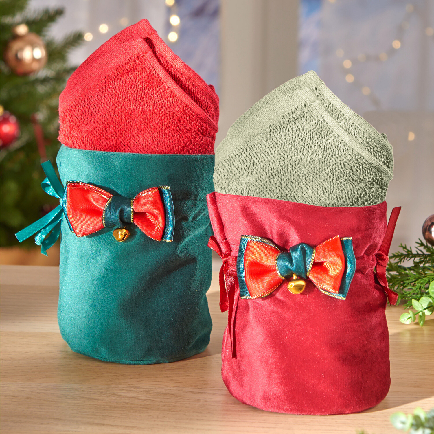 Překvapení! Tato elegantní sametová taška s mašlí a zvonečkem obsahuje 2 ručníky pro hosty z nadýchaného froté. Vždycky je budete potřebovat! Se 2 ručníky pro hosty. Čistá bavlna. Nápad na dárek. 3dílná souprava. Eldo.