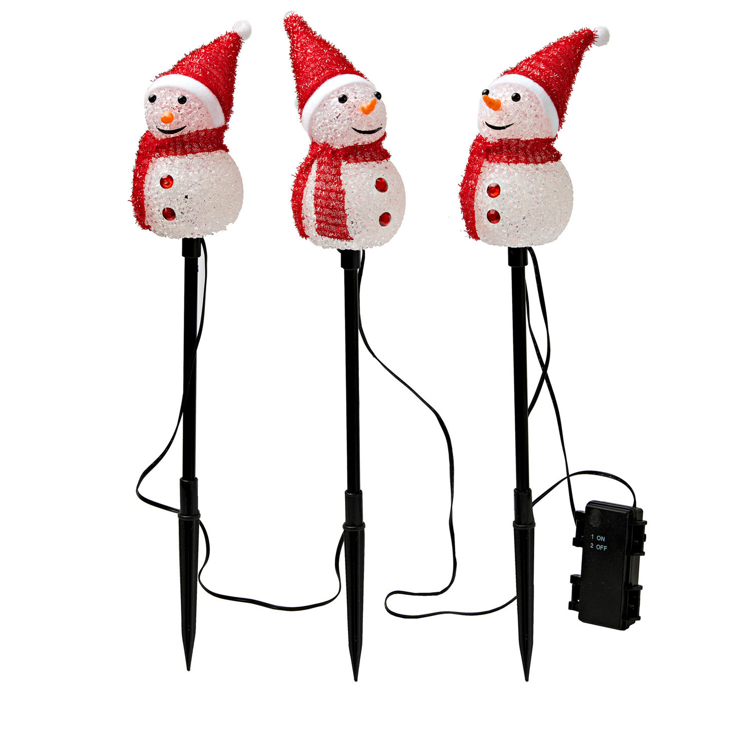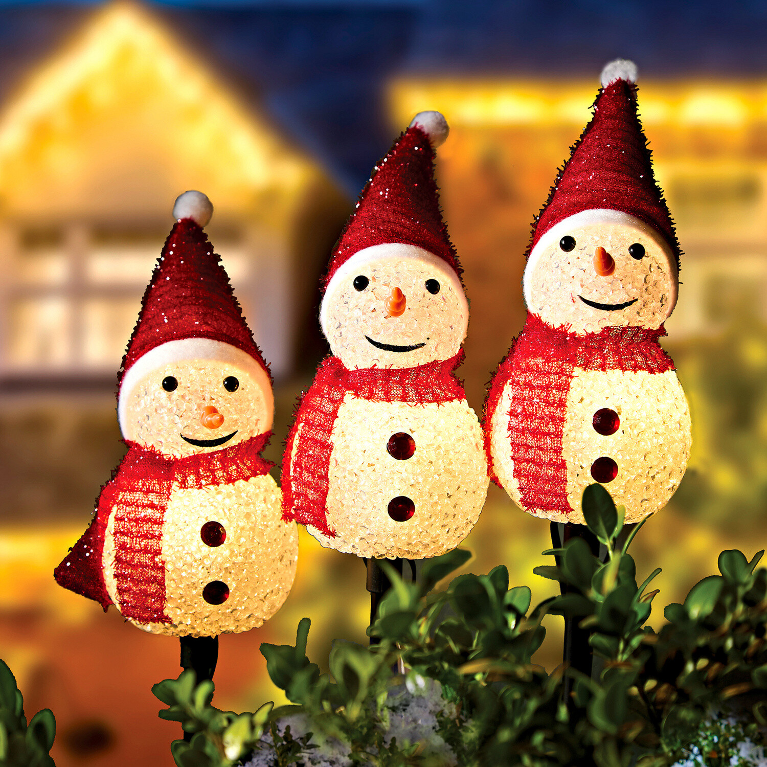 Naše zábavné trio sněhuláků s nosy z mrkví a špičatými klobouky vytvoří na zahradě slavnostní atmosféru. Díky teplým bílým LED diodám svítí do tmy. Teple bílé LED. K zapíchnutí do země. Odolné vůči počasí. Provoz na 3 mikro baterie AAA (nejsou součástí).. Gainsborough.