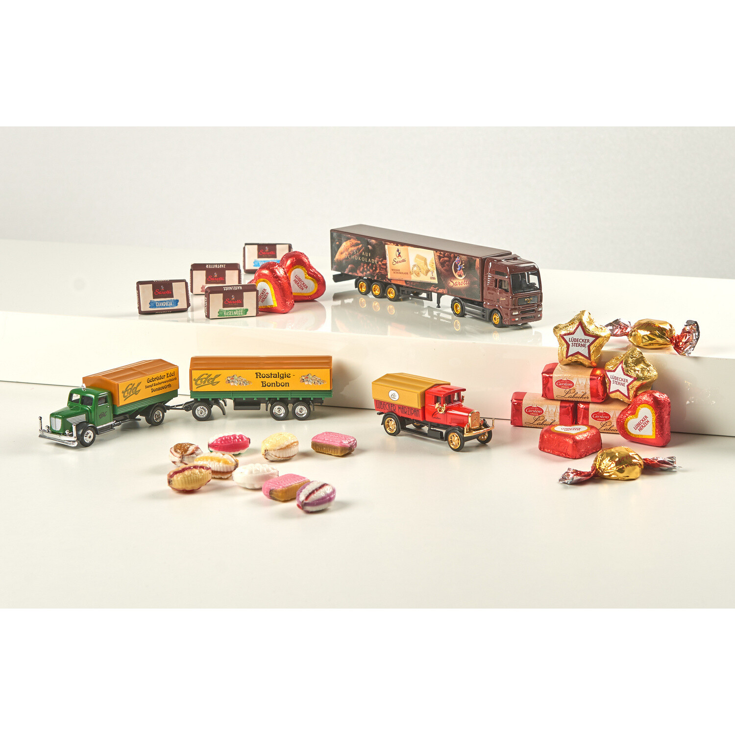 3 autentické nostalgické kamiony se sladkým nákladem! 1 kamion s cukrovinkami s přívěsem a 50 g lahodné směsi Fourree. 1 kamion s 50 g originálních lübeckých marcipánových srdíček. 1 kamion "Chuť na čokoládu" s lahodnou směsí Napolitains. Perfektní dárek pro vášnivé sběratele kamionů! Prosím vezměte na vědomí, u potravin je vyloučena možnost výměny zboží, kromě opodstatněné reklamace jakosti.