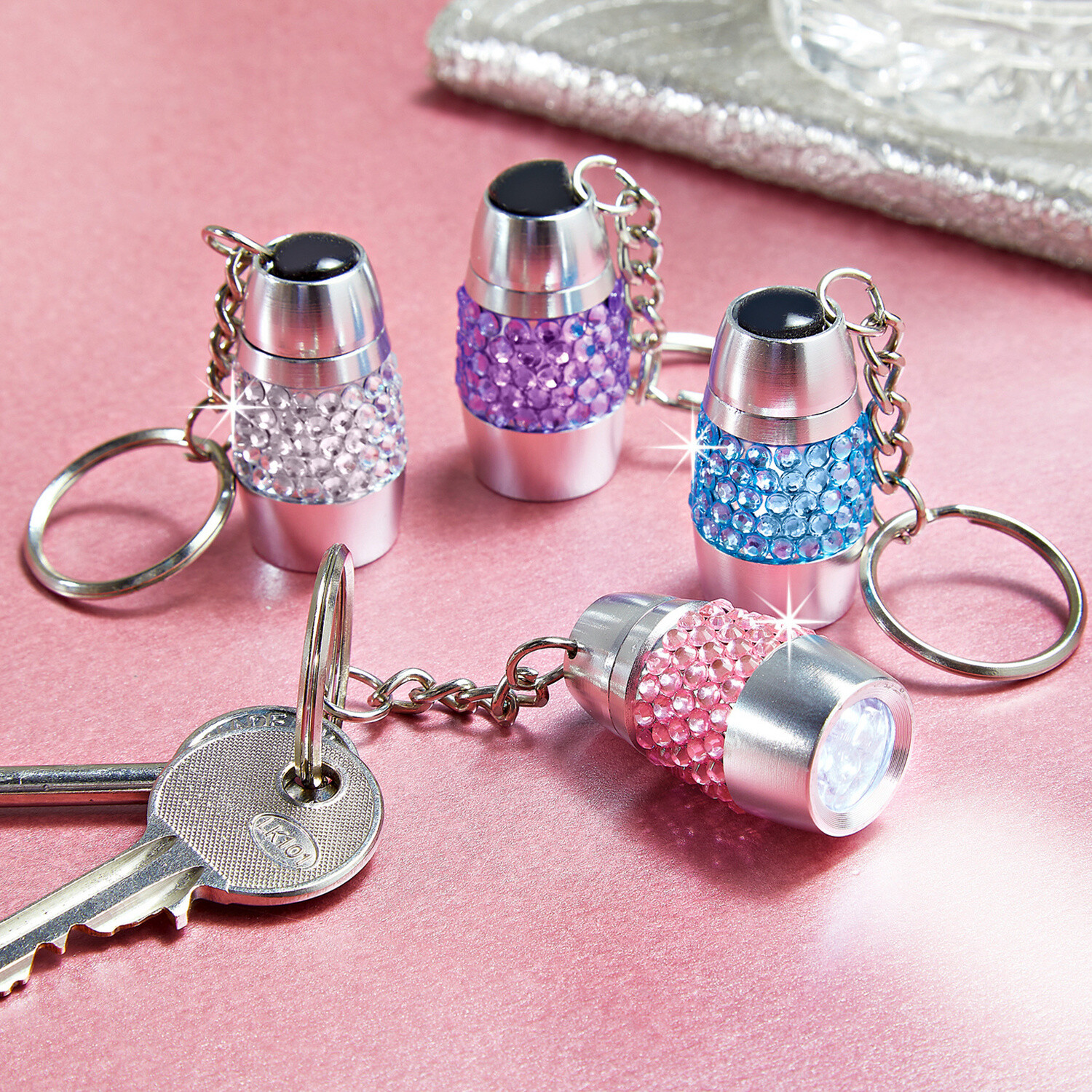 Někdy světlo do kabelky, někdy světlo na klíčové dírky a společník do tmy: 4 elegantní svítilny s blikajícími kamínky - praktické do každé klíčenky. Mini svítilny. Ve 4 barvách. Posázené kamínky. Provoz na baterie. Sada 4 ks. Každá včetně 2 baterií CR1220.