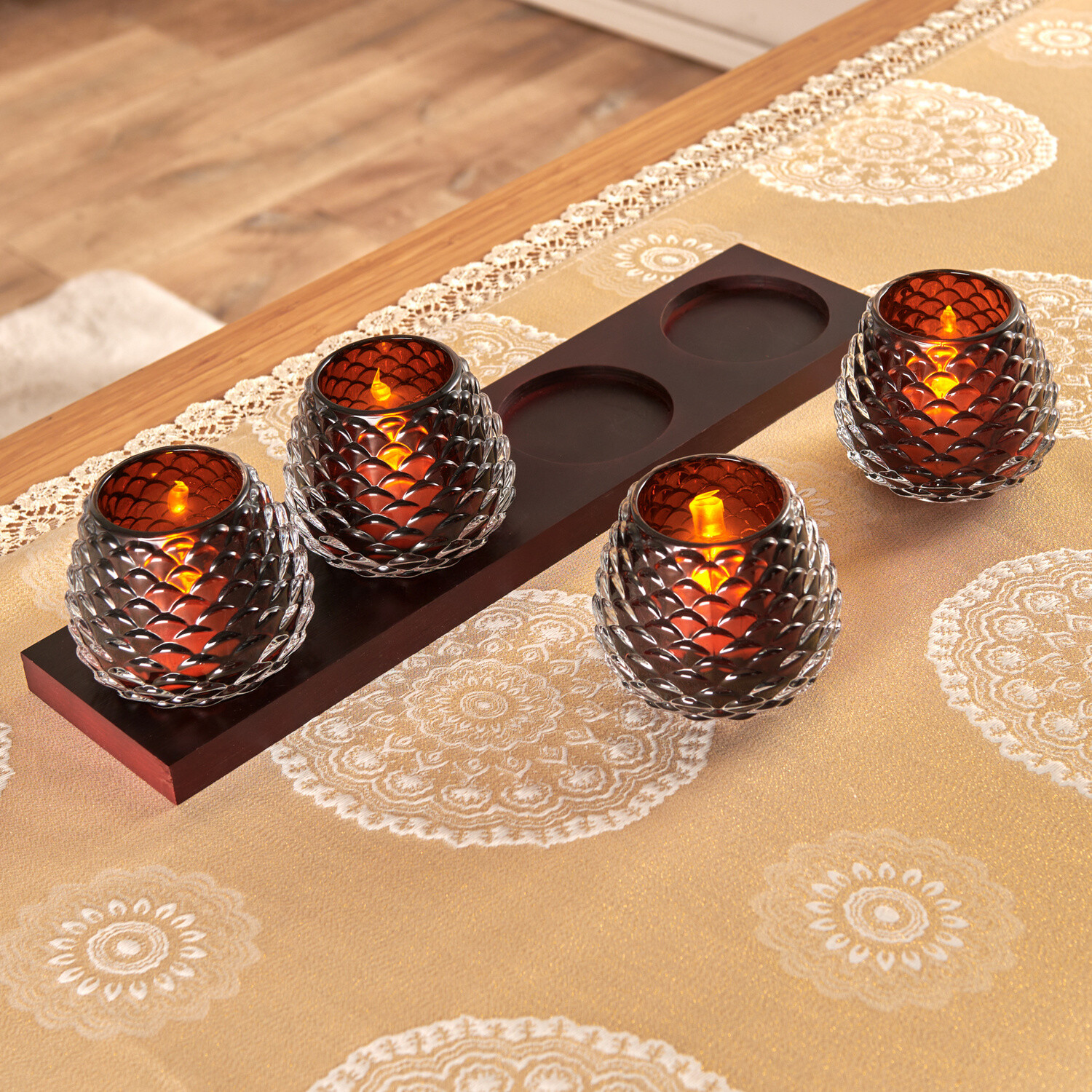 Čtyři svícny na čajové svíčky z masivního skla ve tvaru mnohostranného kužele na lakovaném dřevěném podnosu. Velmi kvalitní a dekorativní – i jako alternativa adventního věnce. Dodáváno bez čajových svíček.