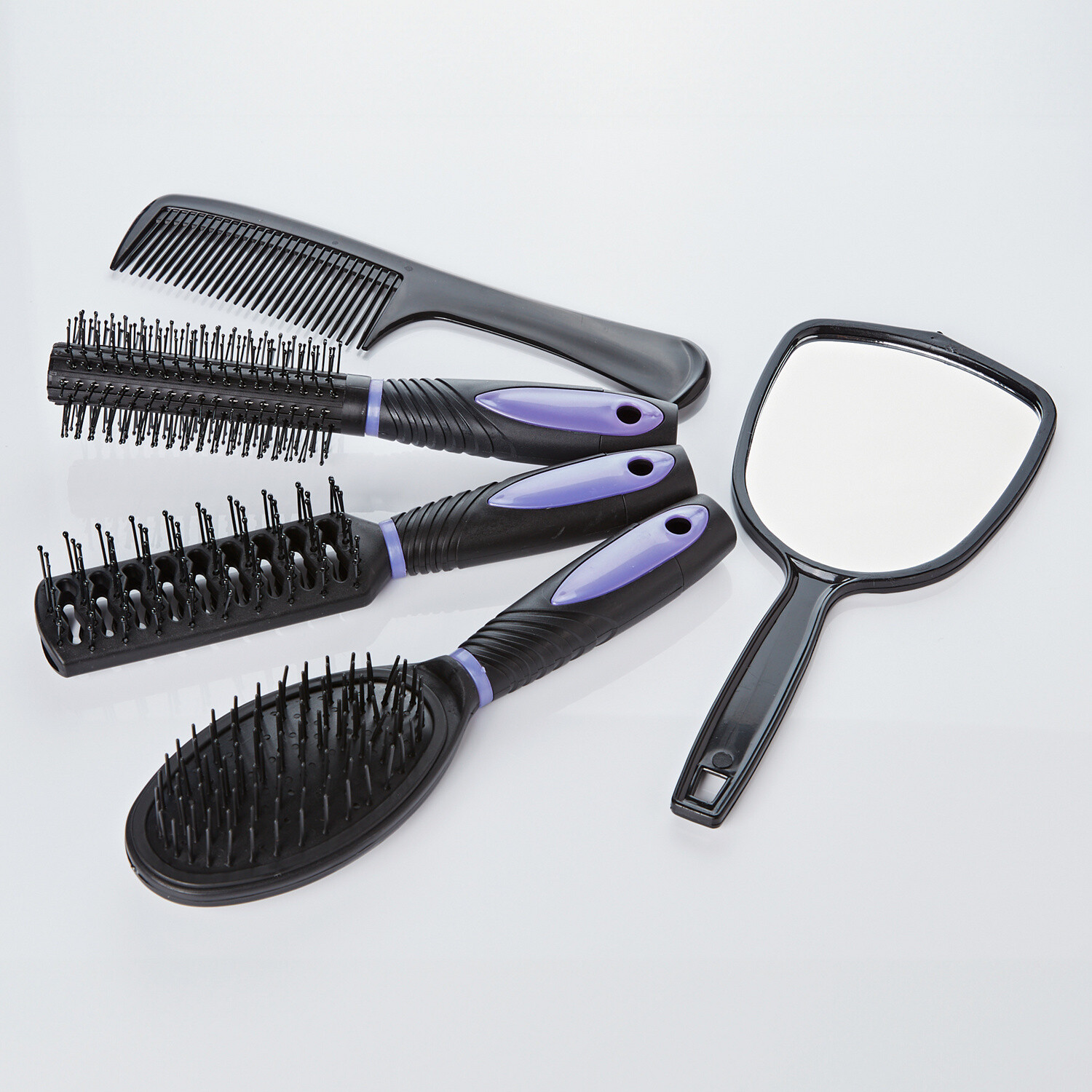 Stojan pohodlně uloží vše, co potřebujete pro každodenní úpravu vlasů. Obdélníkový kartáč dokonale uhladí Vaše vlasy. Kulatý kartáč vytváří trendy vlny a kadeře, zatímco kartáč s odvětrávacím otvorem podporuje rychlé vysoušení a úpravu. Součástí je hřeben a ruční zrcadlo. Snadno se čistí. Pro dámy a pány. Včetně stojanu.Včetně stojánku.