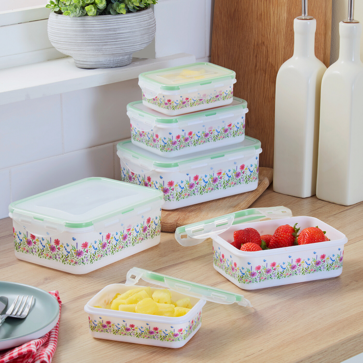 Těchto 6 dóz na potraviny se silikonovým těsněním udrží zbytky jídla, svačiny nebo zásoby déle čerstvé. Ideální do lednice nebo spíže. Po použití lze stohovat pro úsporu místa. S víčky. Lze složit do sebe. Ideální do lednice a na skladování. 12,5 x 9 x 4 cm, 15,8 x 11,5 x 5,5 cm, 18,8 x 13,7 x 6,8 cm, 22,7 x 16 x 8 cm, 26 x 19 x 10 cm, 29 x 22,5 x 11,5 cm.. Basilico.