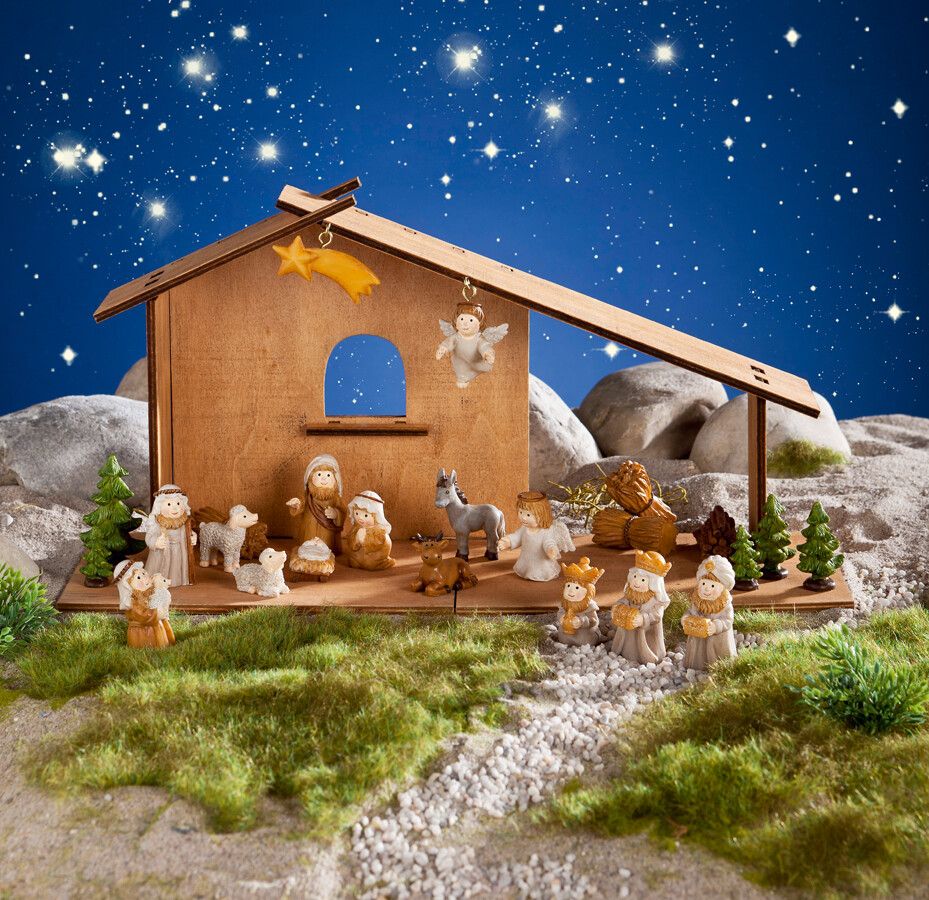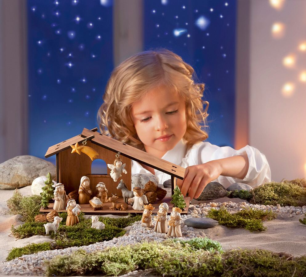 S tímto adventním kalendářem si sami vyrobíte půvabný betlém. Každý den do Vánoc má tento adventní kalendář připravenou novou postavičku či součást, tak aby na Štědrý den byl betlém kompletní. Včetně dřevěné stáje s jednoduchým zásuvným systémem. Marie a Josef, tři králové, pastýři, beránci a andělé kolem Ježíška v jesličkách. Figurky lze libovolně rozestavit. Materiál: dřevo, umělý kámen, papír. Rozměry:10 x 13 x 26 cm; figurky 5 cm.