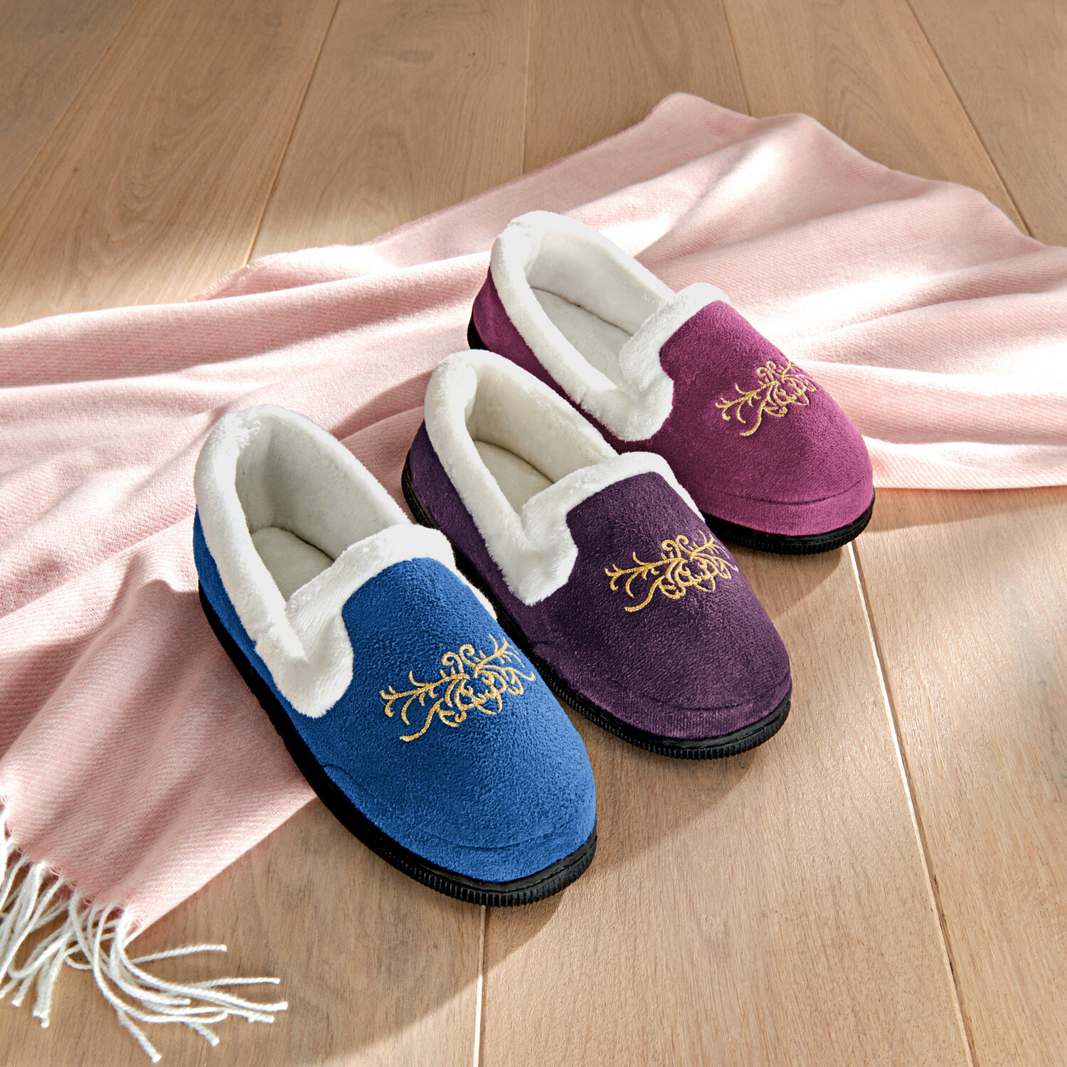 Dopřejte si tyto pantofle s elegantním vyšívaným erbem a huňatou fleecovou podšívkou. Stélka z paměťové pěny je úžasně pohodlná a netiskne. Robustní podešev.S příjemným fleecem s paměťovou stélkou. Elegantní výšivka z královské bavlny. Super měkké, teplé a pohodlné. Protiskluzová podešev. 3 krásné elegantní barvy.