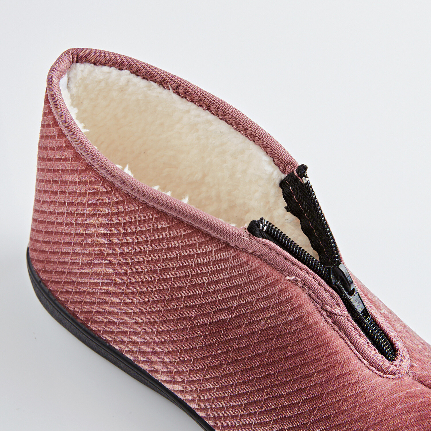 Lesklý velur na vnější straně s jemnými strukturovanými proužky, sametově hebká hřejivá podšívka uvnitř! Tyto pantofle si zamilujete. Snadno se obouvají pomocí zipu – úžasně útulné a pohodlné. Podpatek cca 1 cm. Lesklý velur. Hřejivá podšívka. Jednoduchá obouvání. Protismykové. Podpatek cca 1 cm.