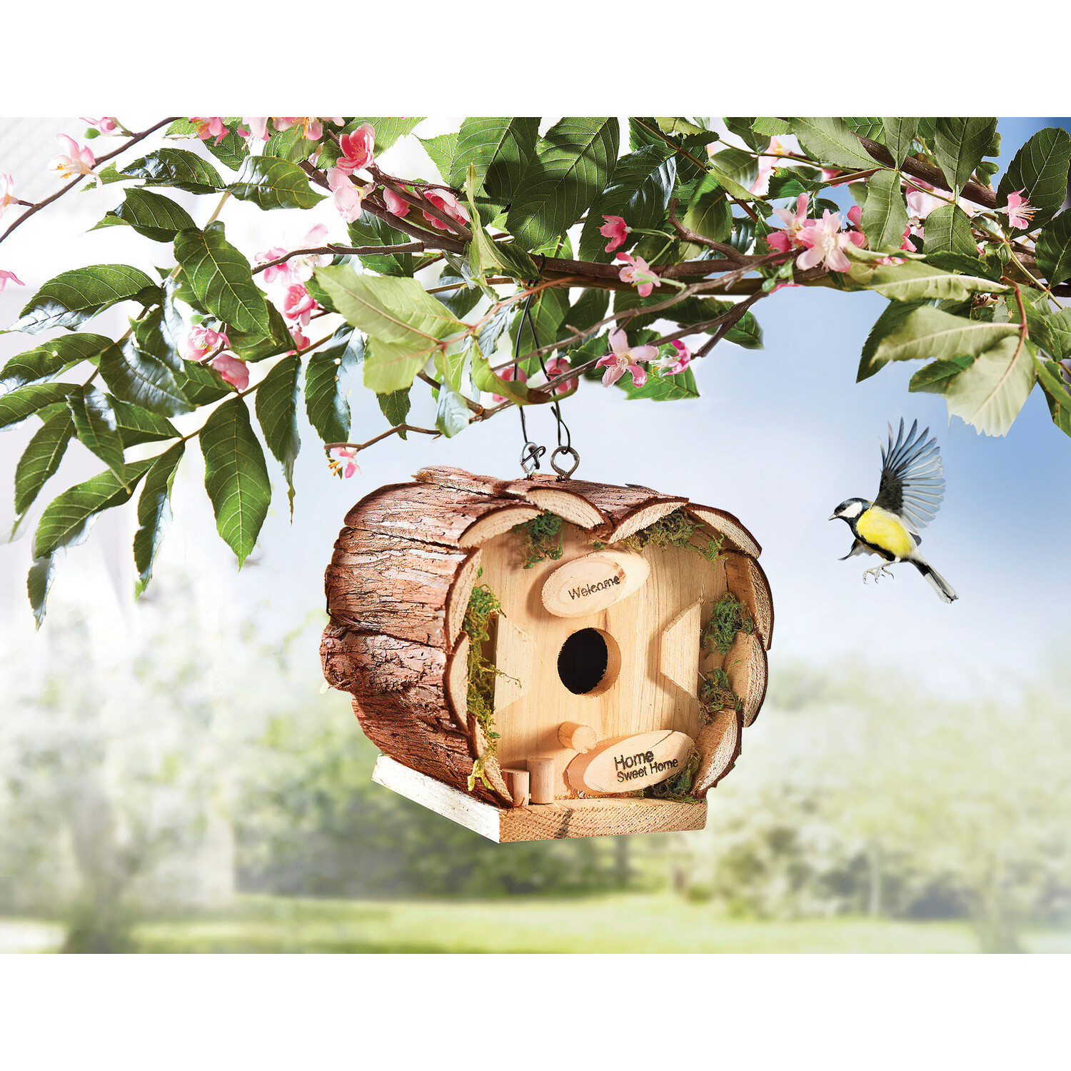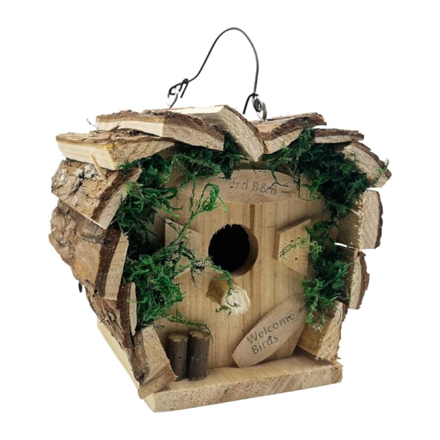 Dřevěná budka pro ptáčky nabízí bezpečné místo pro hnízdění nebo krmení. K zavěšení nebo postavení. Masivní dřevo - šetrné k přírodě. Plně smontované - připravené k okamžitému použití. Drát k zavěšení budky. Stabilní + lze také postavit.