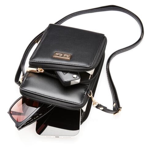 Tato elegantní černá taštička přes rameno značky Carla Faustini je perfektní pro každodenní použití. S několika kapsami na zip poskytuje bezpečný prostor pro Váš mobilní telefon, klíče a peněženku. Nastavitelný popruh umožňuje pohodlné nošení. Univerzální a stylová – ideální na cesty!