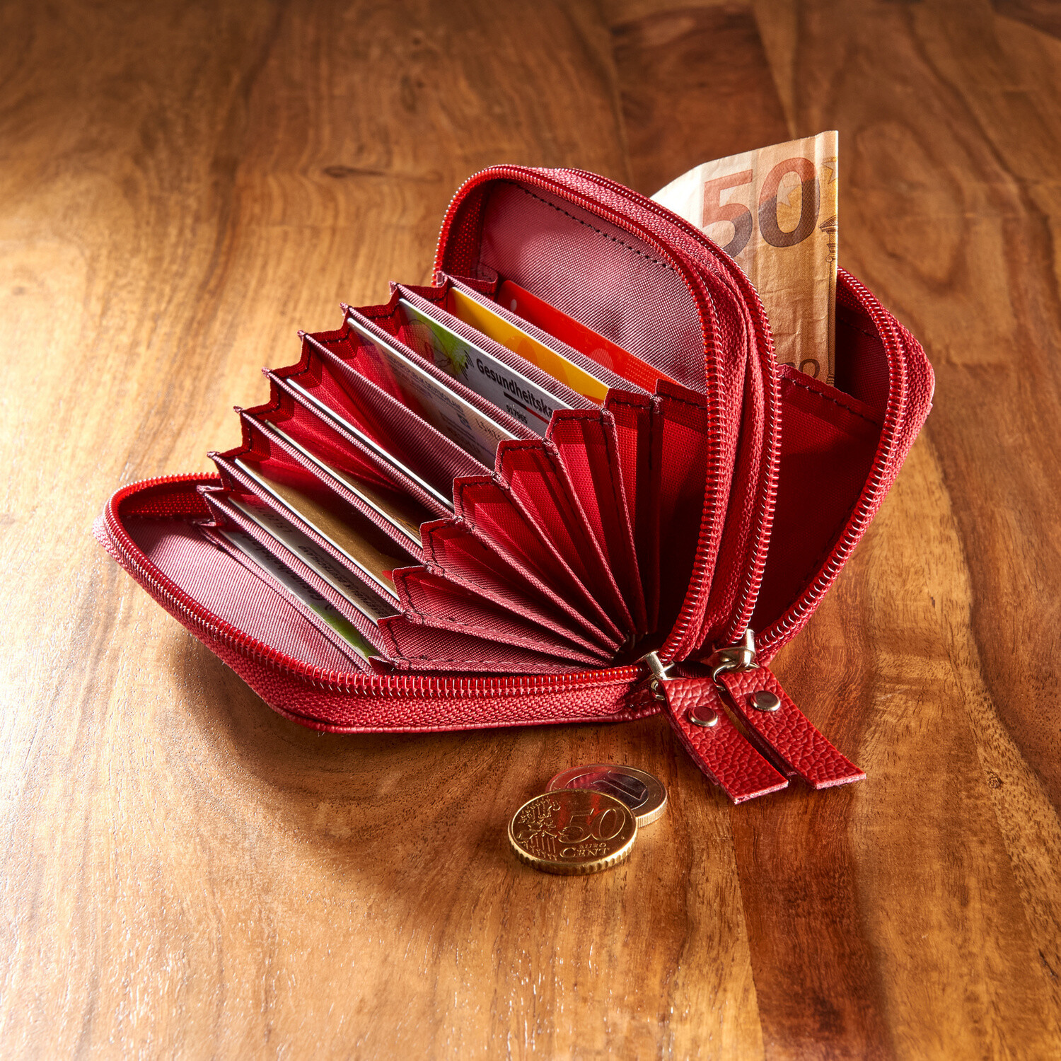 Jedna strana na karty a doklady, druhá na drobné a bankovky – samostatně uzamykatelná a pevně připojená k této stylové kožené dvojité peněžence. Samozřejmě s ochranou RFID pro maximální zabezpečení proti krádeži dat. Pravá kůže. Peněženka a pouzdro na karty zároveň. Lze uzavřít na obou stranách pomocí zipu. S RFID ochranou dat. Ve 2 barvách. Ve 2 barvách.