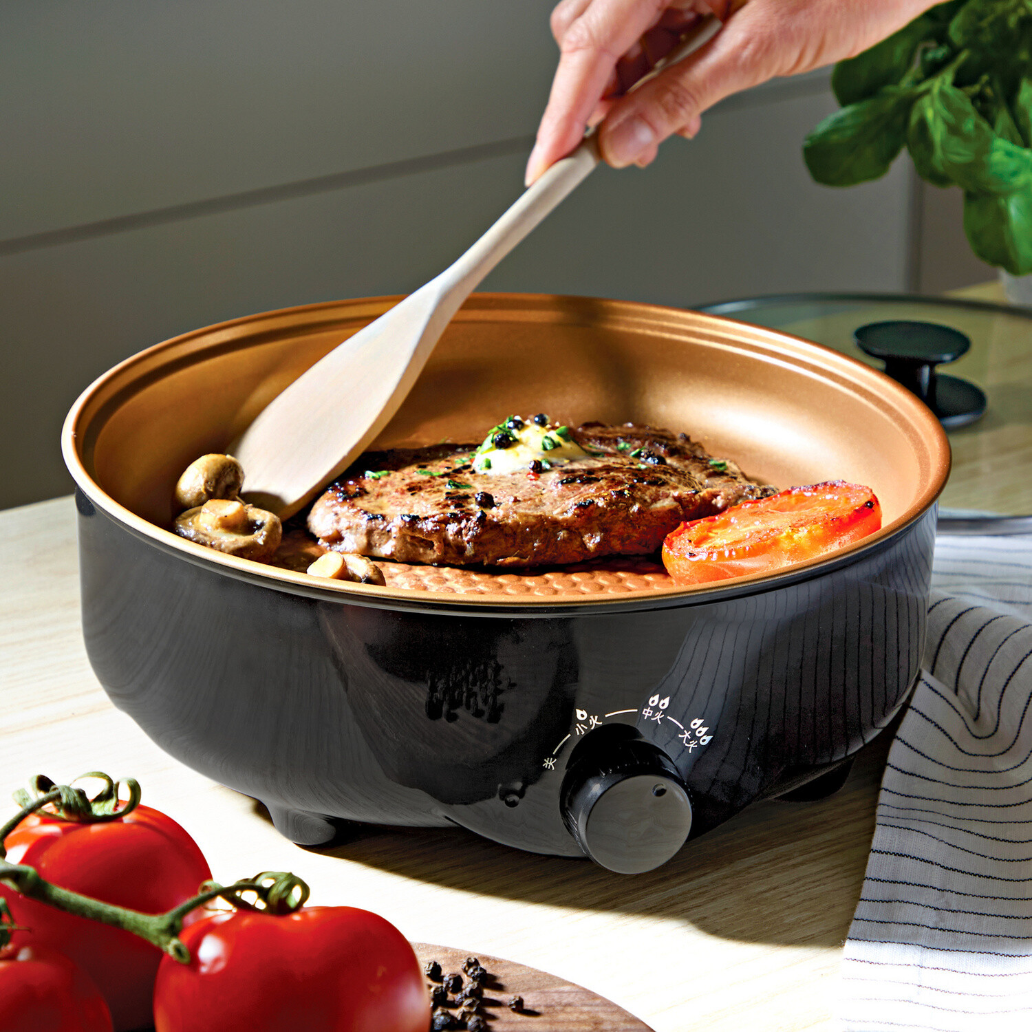 Z kuchyně přímo na stůl! Tuto elektrickou pánev potřebuje každý! Dostatečně velká pro přípravu jídla, kompaktní a snadno skladovatelná. Nastavitelná teplota pro pomalé nebo rychlé vaření. Vaření bez sporáku. Se skleněným víkem. Nízká hmotnost: pouze 1 kg. S nepřilnavým povrchem. Úspora místa při skladování.