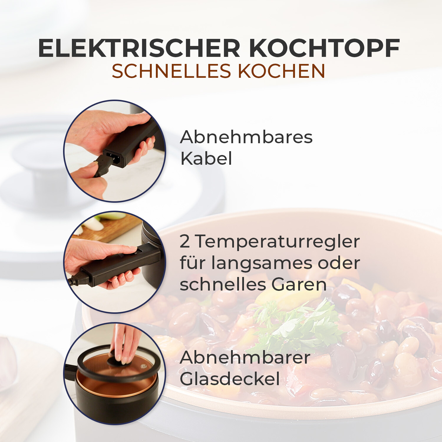 Ideální pro domácnosti bez sporáku. Bez sporáku a dalšího kuchyňského náčiní. Se 2 ovladači teploty pro pomalé nebo rychlé vaření, ochranou proti přehřátí a nepřilnavým keramickým povrchem. Tlakový hrnec na smažení, vaření, dušení + udržování tepla. Rychlé zahřátí během několika minut. 2 teplotní úrovně - stálé udržování tepla. Vysoce kvalitní nepřilnavý keramický povrch. Izolované vnější stěny - žádné opaření při servírování. Příjemně lehký + snadno se čistí. Ideální na doma + na cesty. Délka síťového kabelu 80 cm. 13x20x35,5 cm. Objem 1,4 l.