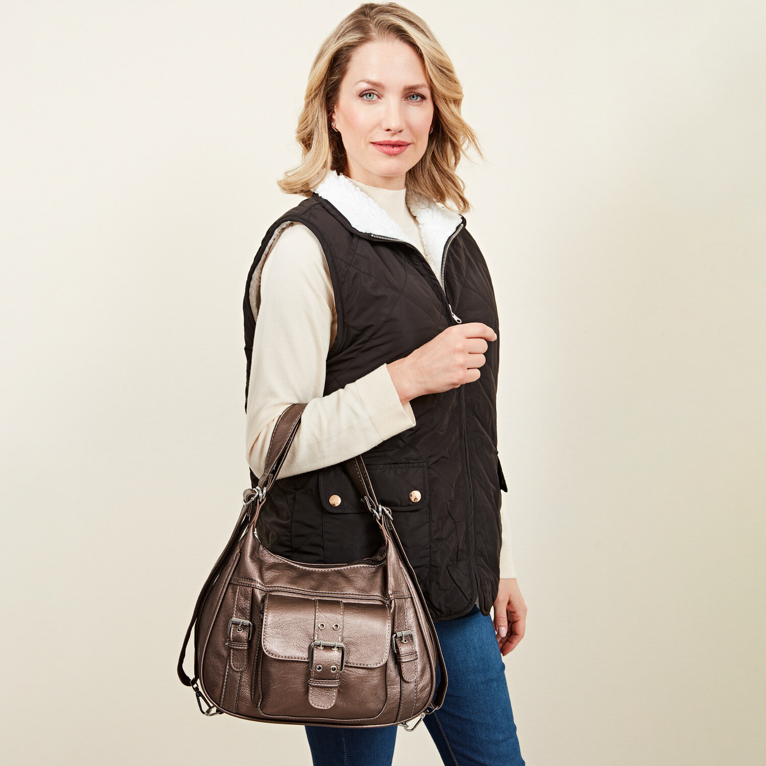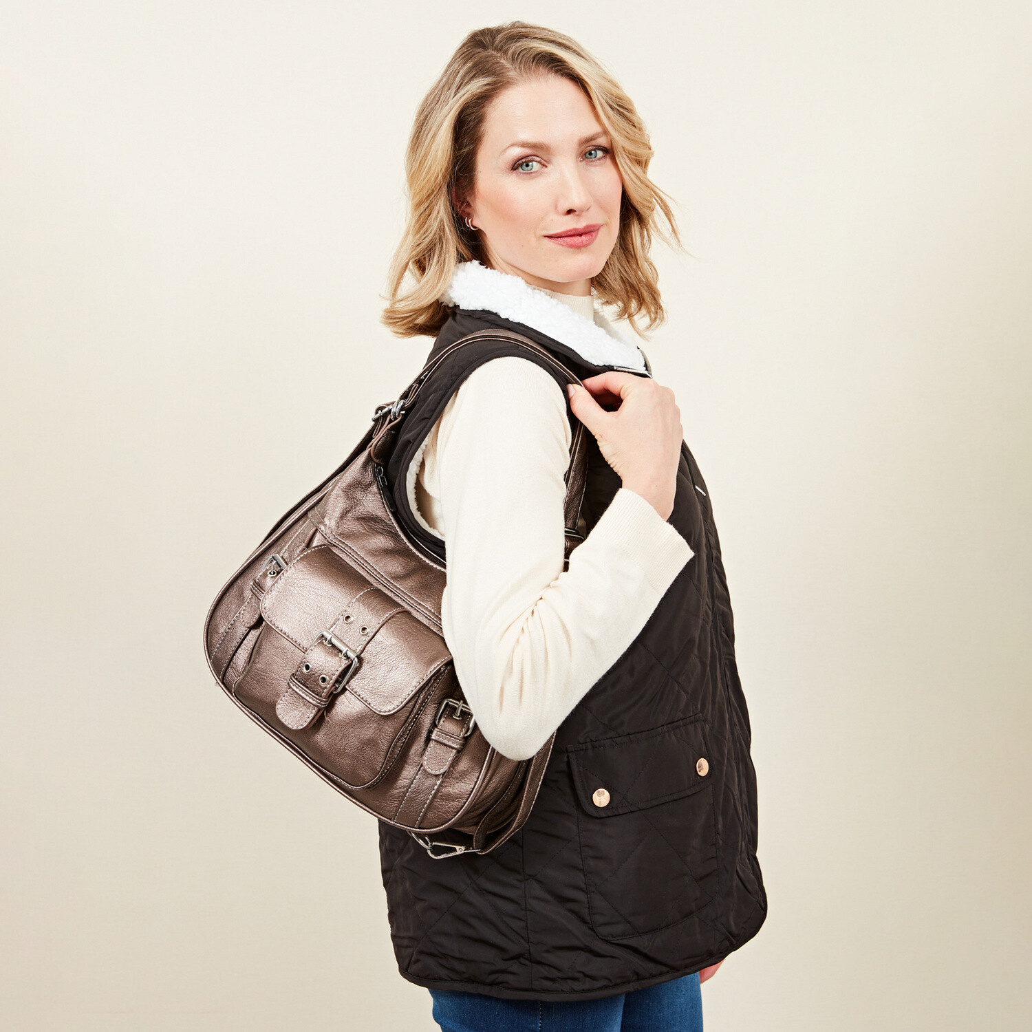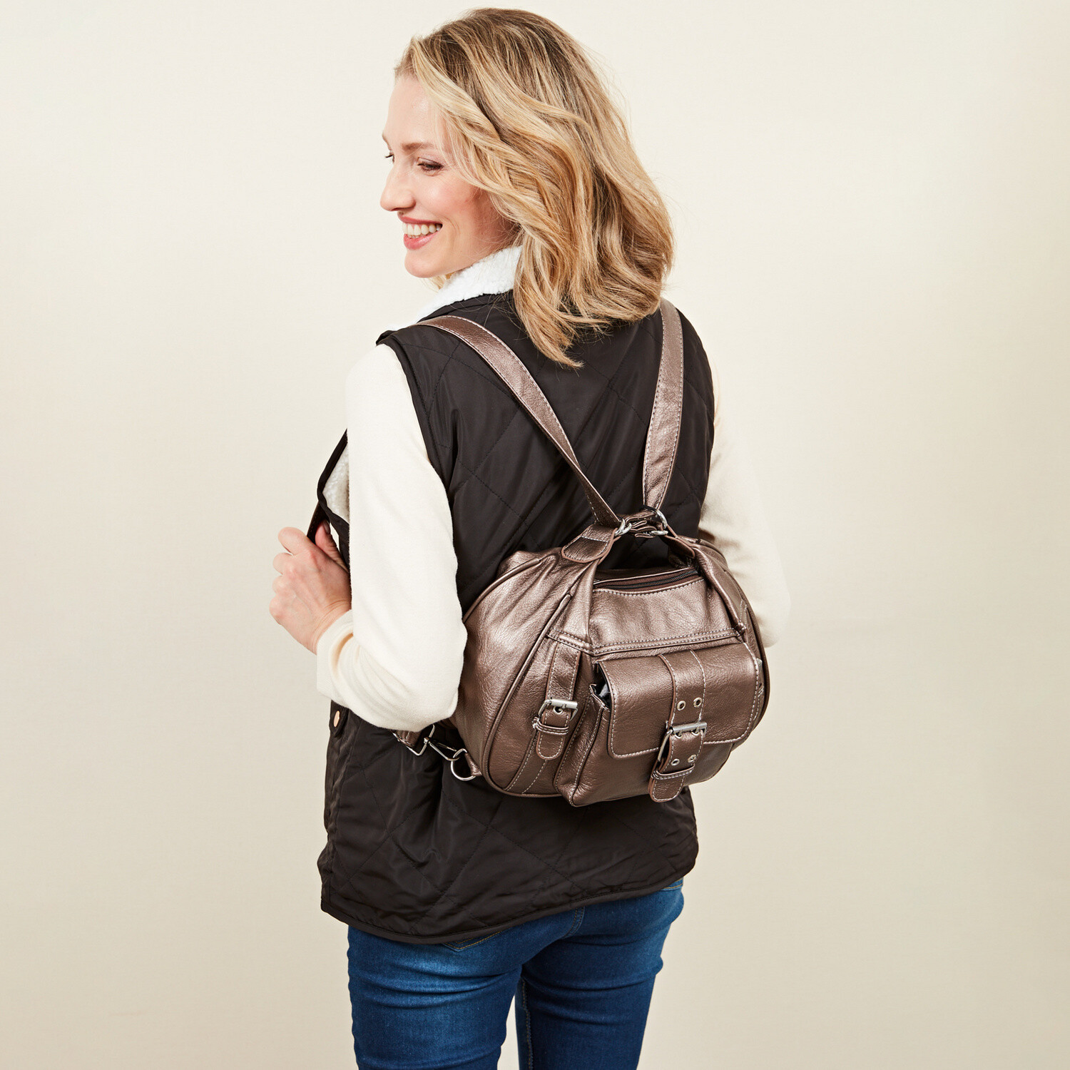 Tato elegantní kabelka přes rameno s ozdobnými sponami se za okamžik promění v batoh. Velmi prostorná, s přihrádkami na zip a přední kapsou s magnetickým zapínáním. Vejde se do ní toho opravdu hodně. Prostorná. Ozdobné spony. Variabilita nošení. Nastavitelné popruhy.