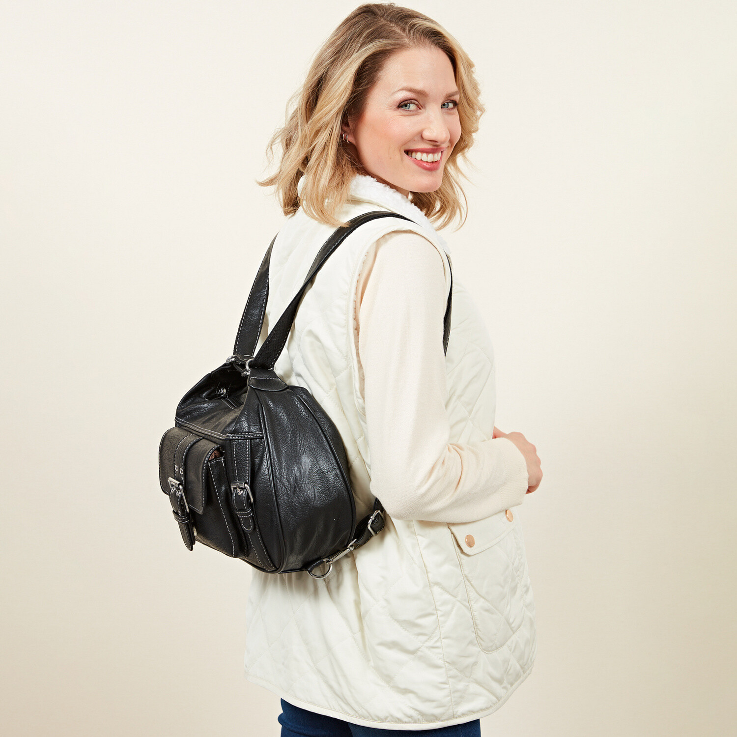 Tato elegantní kabelka přes rameno s ozdobnými sponami se za okamžik promění v batoh. Velmi prostorná, s přihrádkami na zip a přední kapsou s magnetickým zapínáním. Vejde se do ní toho opravdu hodně. Prostorná. Ozdobné spony. Variabilita nošení. Nastavitelné popruhy.