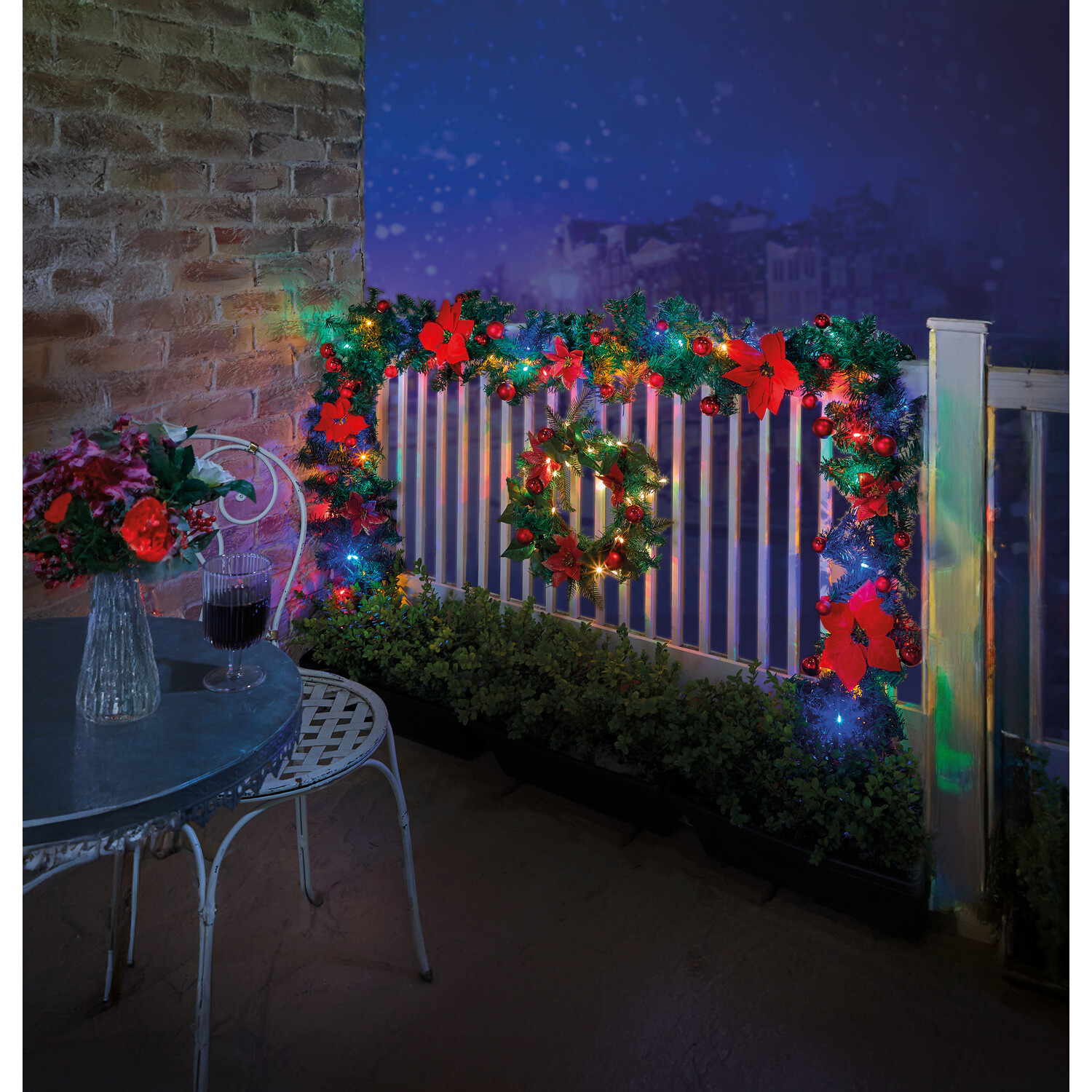 Vyzdobte si terasu nebo balkon tímto luxusním jedlovým věncem a girlandou. Bohatě zdobené vánočními hvězdami, ozdobami a stuhami. Okouzlí pestrými barvami a světelnou hrou – rok co rok. LED. S barevnou hrou světel. 6/18 h časovače. Neopadává. Provoz na 3 tužkové baterie AA, 1,5 V (nejsou součástí).