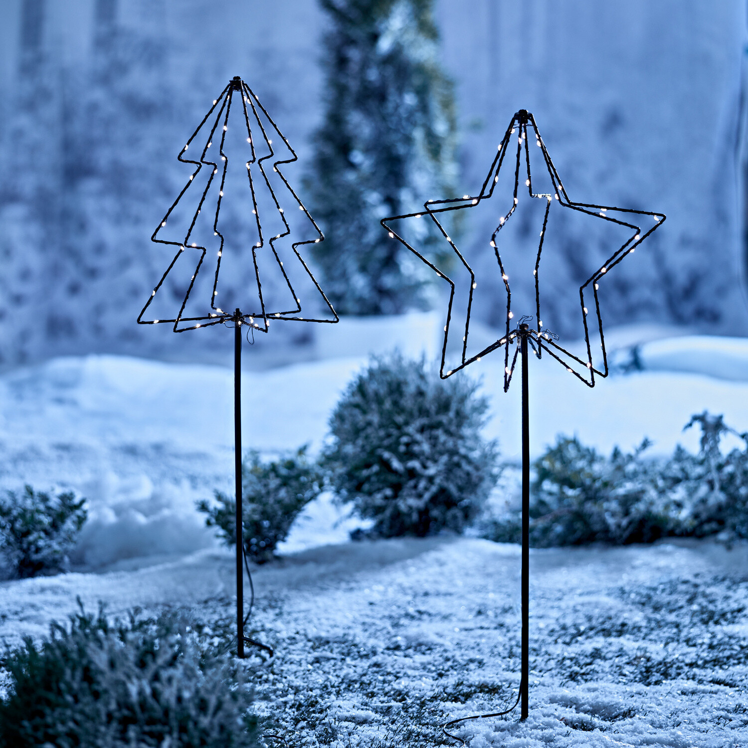 Tyto kovové dekorace vyzařují slavnostní očekávání, ať už na záhonech, v květináčích nebo v balkonových truhlících. S časovačem pro stisknutí tlačítka!LED. S časovačem. Provoz na 3 tužkové baterie AA, 1,5 V (nejsou součástí). Včetně vnějšího boxu s krytím IP45.