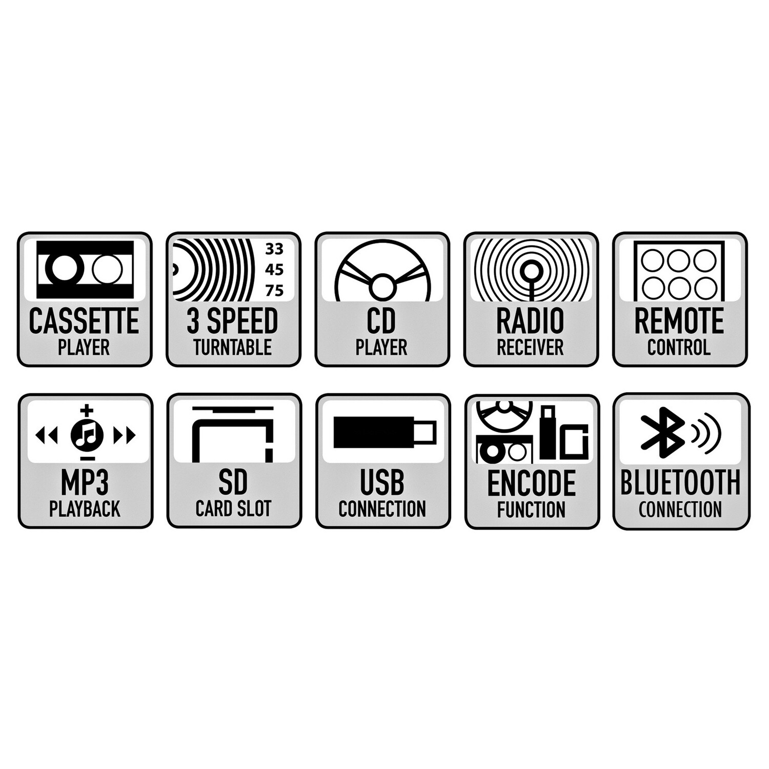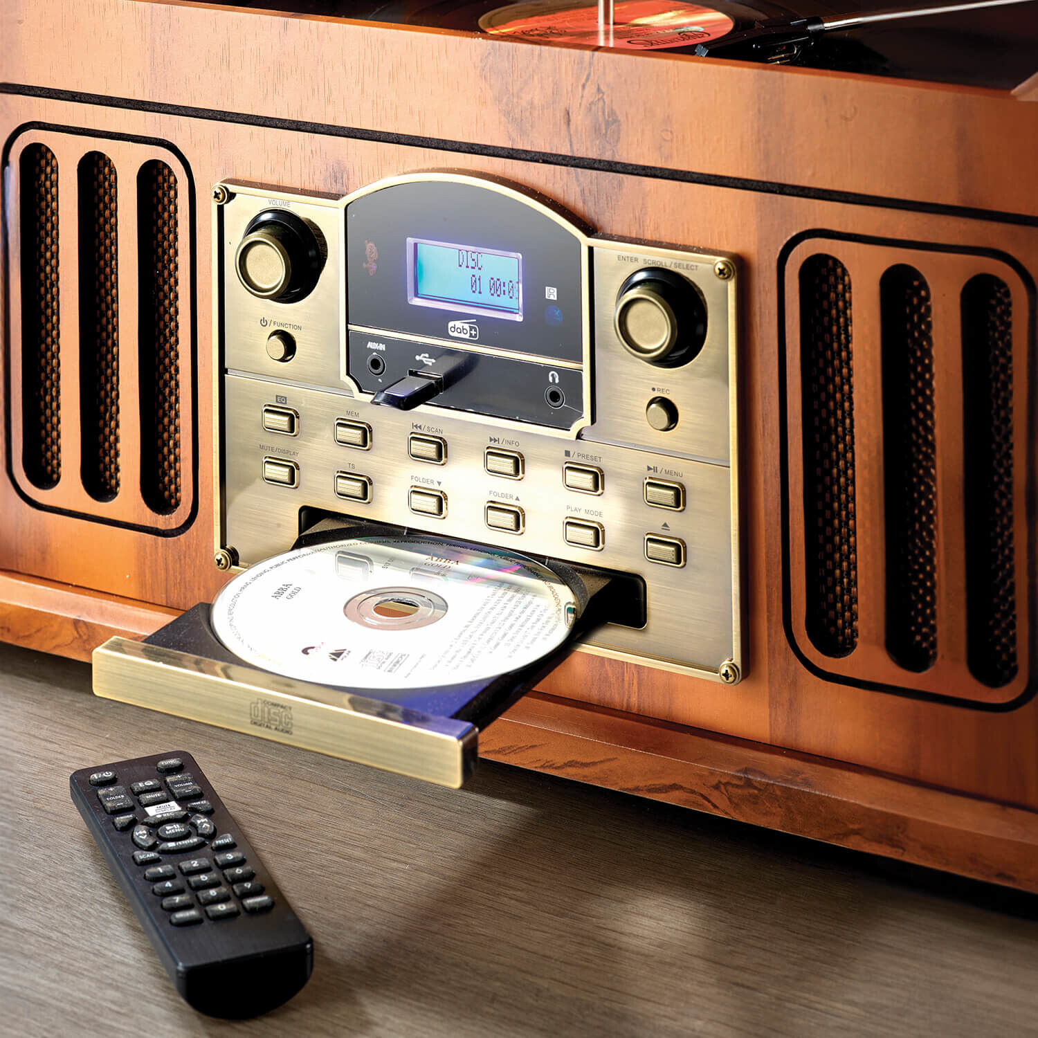 Vychutnejte si svou oblíbenou hudbu ve stereu - ať už z CD, CD-R, MP3-CD, CD-RW nebo WMA-CD. Připojte přehrávač MP3 a poslouchejte staženou hudbu nebo připojte zařízení Bluetooth. Digitalizujte své desky, kazety nebo CD bez připojení k počítači. Náš hudební systém Kensington umí vše: přehrávač gramofonových desek (33, 45, 78 otáček za minutu), CD a kazetový magnetofon, přehrávač MP3, rádio FM/DAB a Bluetooth. Včetně výstupu pro sluchátka a dálkového ovládání. Gramofon se 3 rychlostmi. CD + kazetový magnetofon. MP3 přehrávač. FM + DAB rádio. Prémiový systém reproduktorů.