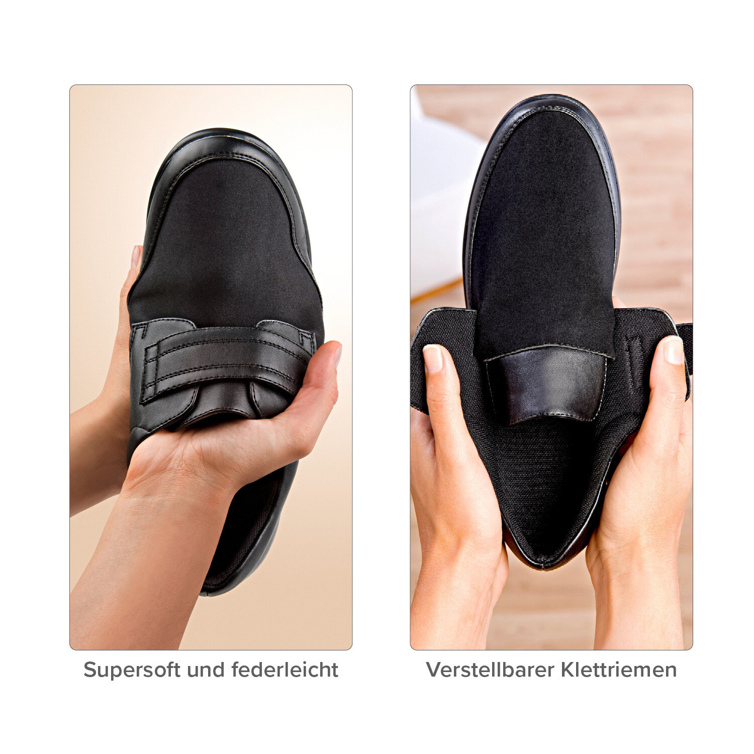 Z měkce polstrovaného, lehkého materiálu, extrémně elastická a pohodlná, zároveň vhodná i na venkovní nošení. Velký polstrovaný vstupní otvor s nastavitelnými pásky na suchý zip. Venkovní i vnitřní obuv. Super měkká + lehká jako peříčko. Přizpůsobí se každé noze. Také při vbočených palcích . Nabízené velikosti 37-42. Nastavitelné pásky na suchý zip.