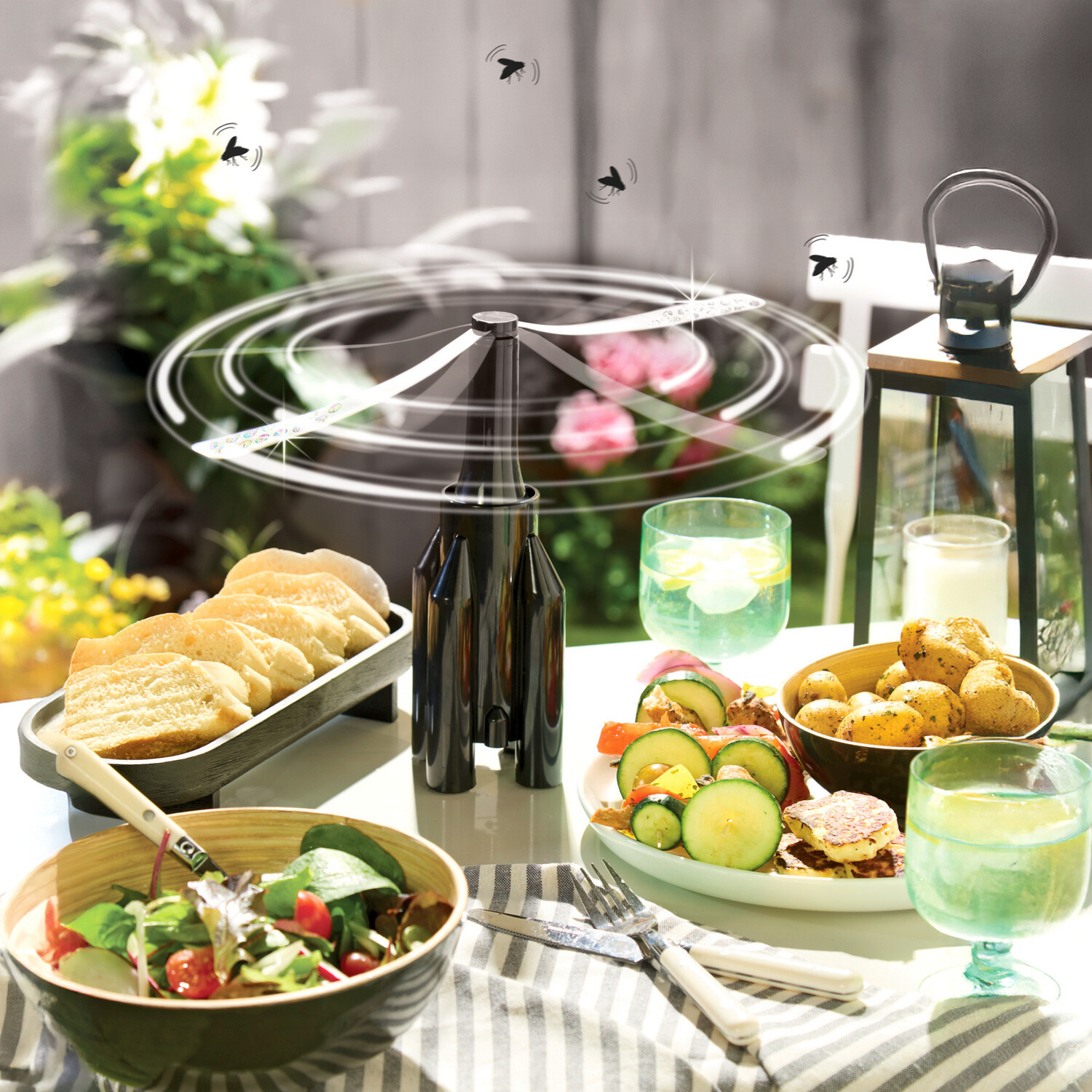 Jemně rotuje a odpuzuje světelnými efekty, aniž by se dotýkal jídel nebo používal chemické látky. Můžete si tak nerušeně vychutnávat stolování pod širým nebem. Rotuje se světelnými efekty. Odpuzuje mouchy a vosy. Zaručená ochrana jídla. Objednejte si také: 8 tužkových baterií AA (nejsou součástí).