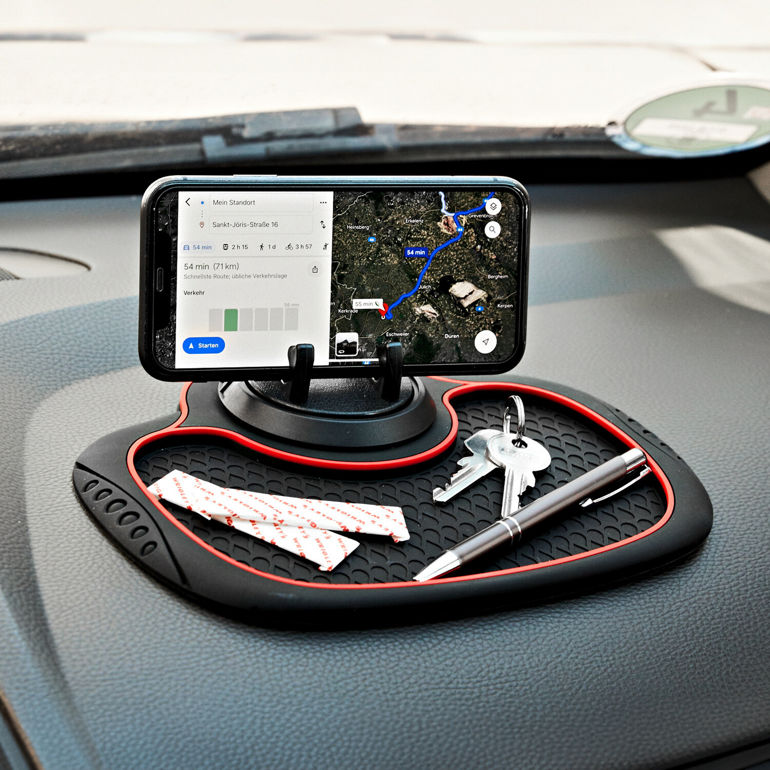 Během jízdy máte na dosah vše potřebné a vidíte svůj chytrý telefon, mince, pera, brýle a další věci. Praktická, protiskluzová podložka na palubní desku s držákem na mobilním telefonu otočným o 360°. Jednoduše drží sama, bez lepidla. Protiskluzová podložka. S možností otáčení.
