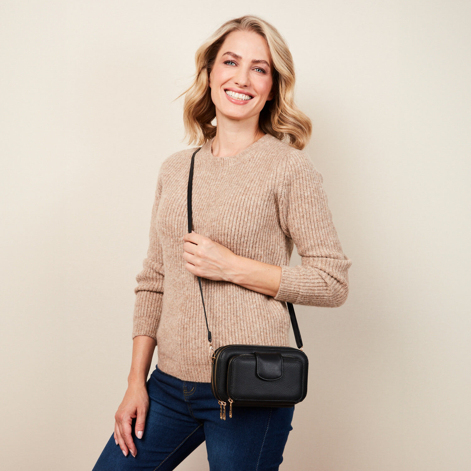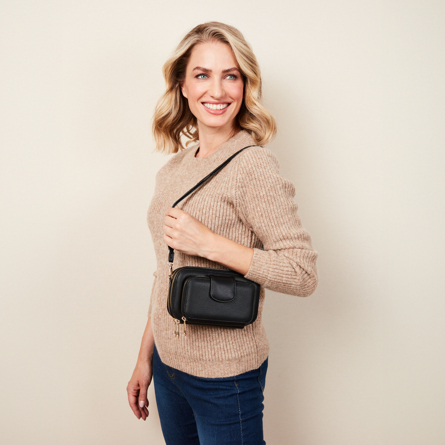 Dvojnásobně praktická: vpředu peněženka s přihrádkami na mince, bankovky a karty. Zadní část se 2 velkými přihrádkami na zip, dalšími přihrádkami na karty a kapsou na mobilní telefon. V elegantním koženém vzhledu s odnímatelným ramenním popruhem, lze nosit také jako kabelku.