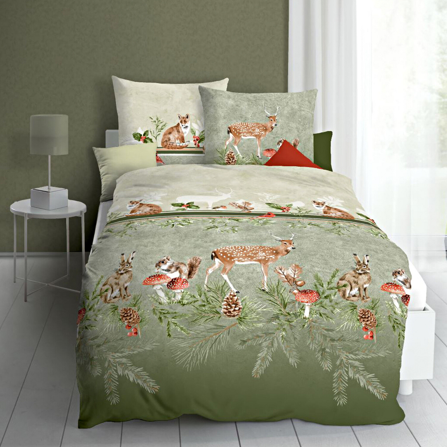 Příjemné povlečení s barevným jmelím a lesními zvířátky. Hřejivý flanel z nadýchané bavlny je ideální pro chladné zimní večery.