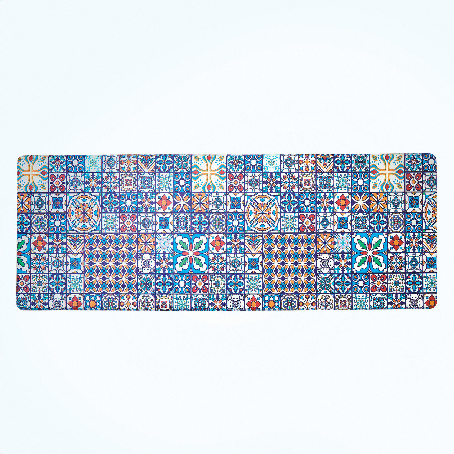 Předložka se stylovým motivem mozaikových dlaždic zajišťuje příjemný pocit při stání a zároveň chrání citlivé podlahy. 8 mm silná vrstva PVC výrazně tlumí nárazy – ideální pro intenzivně využívané prostory, jako je kuchyně, chodba nebo koupelna. Protiskluzová zadní strana, snadno omyvatelná. Měkký došlap. Protiskluzová spodní strana. Snadno omyvatelná. Eldo.