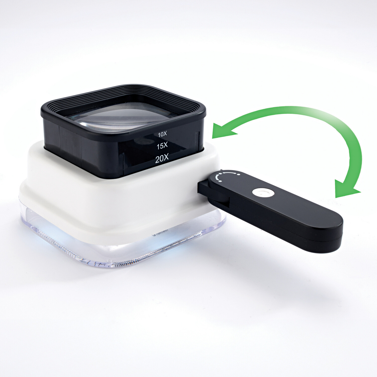 Tuto mimořádně praktickou lupu lze používat třemi různými způsoby: jako závěsnou, se stojanem nebo lupu do ruky. Můžete k ní připevnit pružnou silikonovou rukojeť a díky tomu vám zůstávají obě ruce volné. Rukojeť slouží také jako stojánek, nebo ji můžete zcela odejmout. Rozměry: 18 x 12 cm.