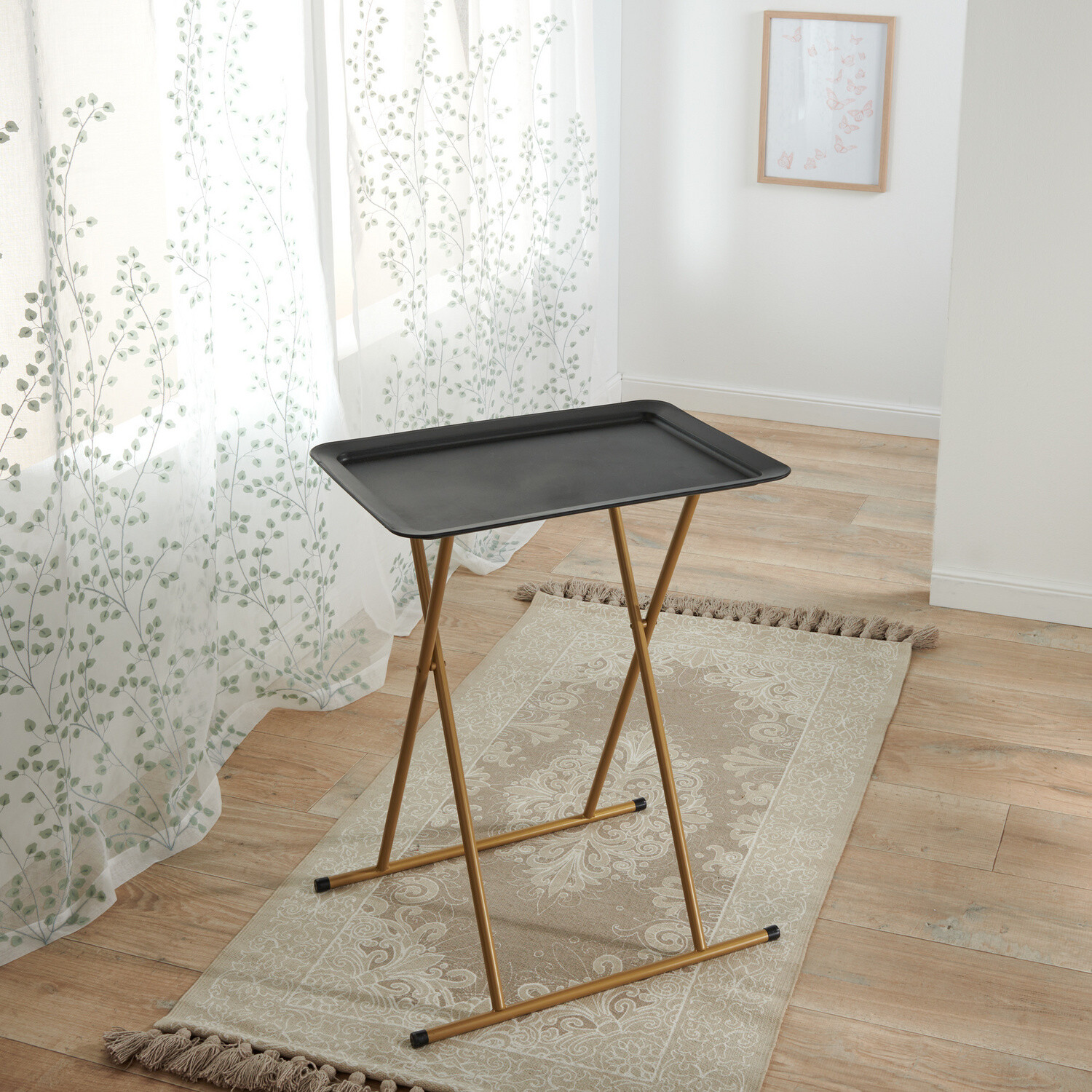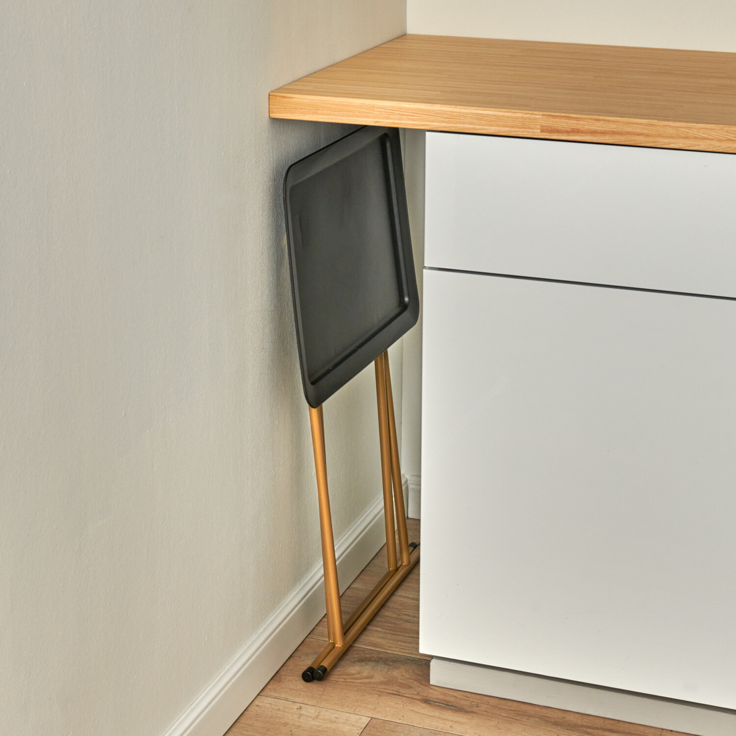 Módní design a vždy tam, kde ho potřebujete! Tento elegantní stolek s matnou kovovou deskou je všestranný jako žádný jiný a po použití jej lze uložit - šetří místem. Skládací . Elegantní dvoubarevný vzhled. Lze použít kdekoli. Stabilní. Po složení je úzký pouze 4 cm.
