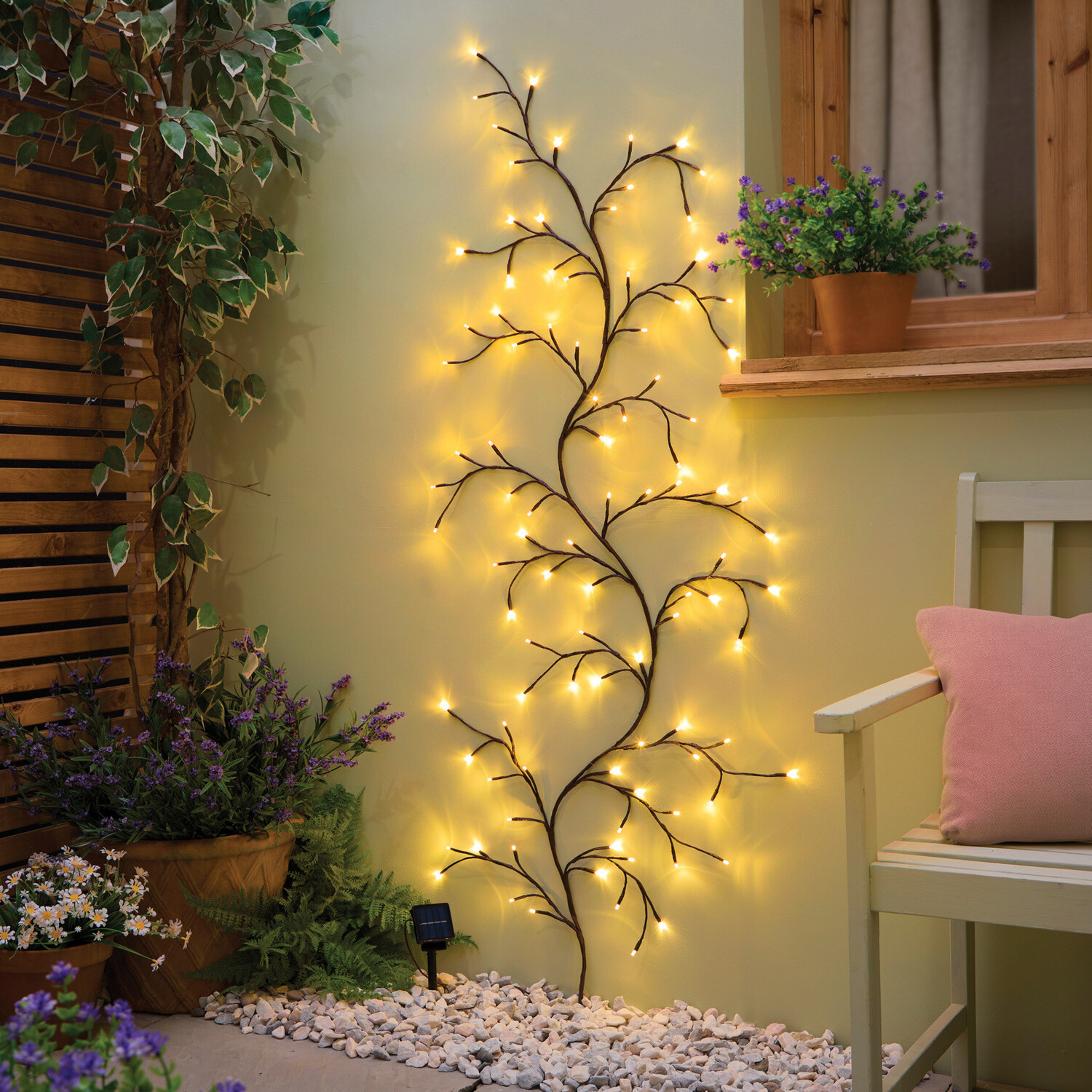Tento vrbový úponek s 96 teplými bílými LED diodami přináší kouzlo na balkony, ploty nebo zdi po celý rok. Napájený solární energií, odolný vůči počasí a s ohebnými větvemi pro kreativní dekoraci. S funkcí nepřetržitého a blikajícího světla. S 96 teplými bílými LED diodami. Flexibilní, tvarovatelný a odolný vůči počasí. Dva světelné módy: stálé a blikající světlo. Na balkon, plot nebo zeď. Gainsborough.