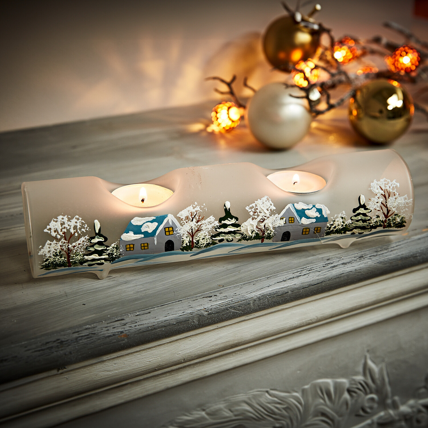 Tento skleněný svícen na čajovou svíčku se zasněnou zimní krajinou zpříjemní atmosféru nejen v době Vánoc.Sklo. Na 2 čajové svíčky. Krásná dekorace na stůl.