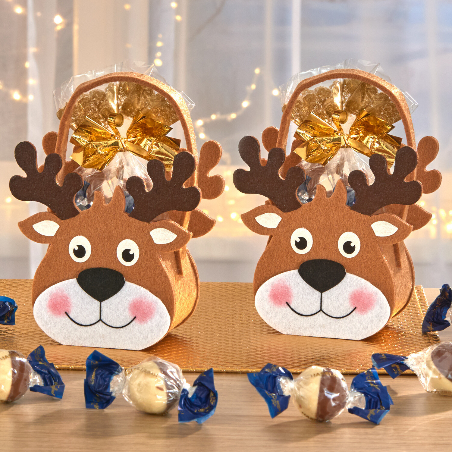 Tento plyšový sob má nadílku plnou lahodných pralinek z bílé a mléčné čokolády s náplní z lísko-oříškového krému - slavnostně zdobeno jako dárek. Prosím vezměte na vědomí, u potravin je vyloučena možnost výměny zboží, kromě opodstatněné reklamace jakosti.