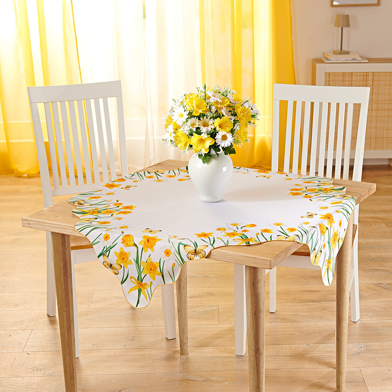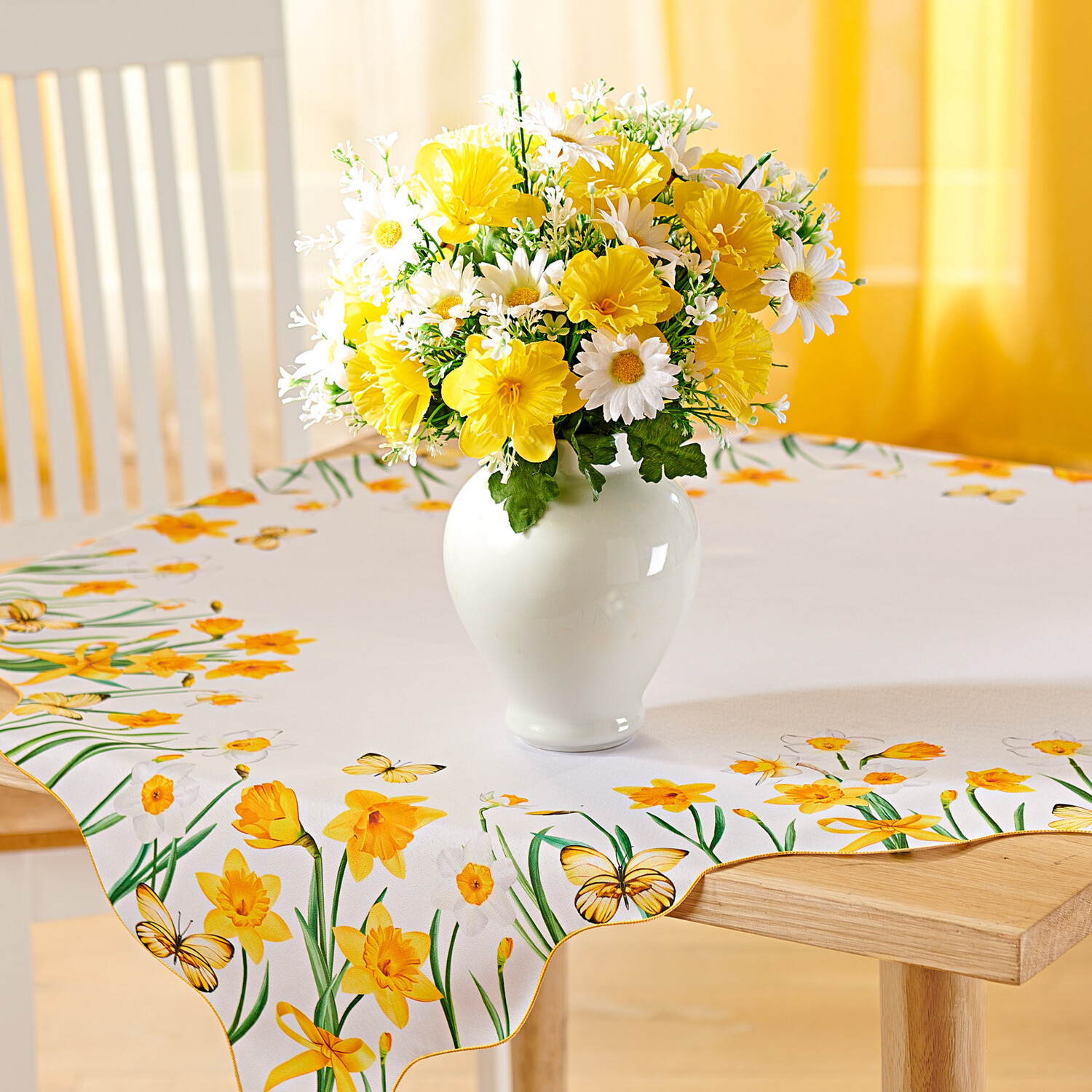 Zářivě žluté narcisy na čistě bílé látce, hedvábný lesk, pečlivě zpracovaný lem – tak jaro prostírá stůl. Pečlivě lemováno. Snadná údržba.