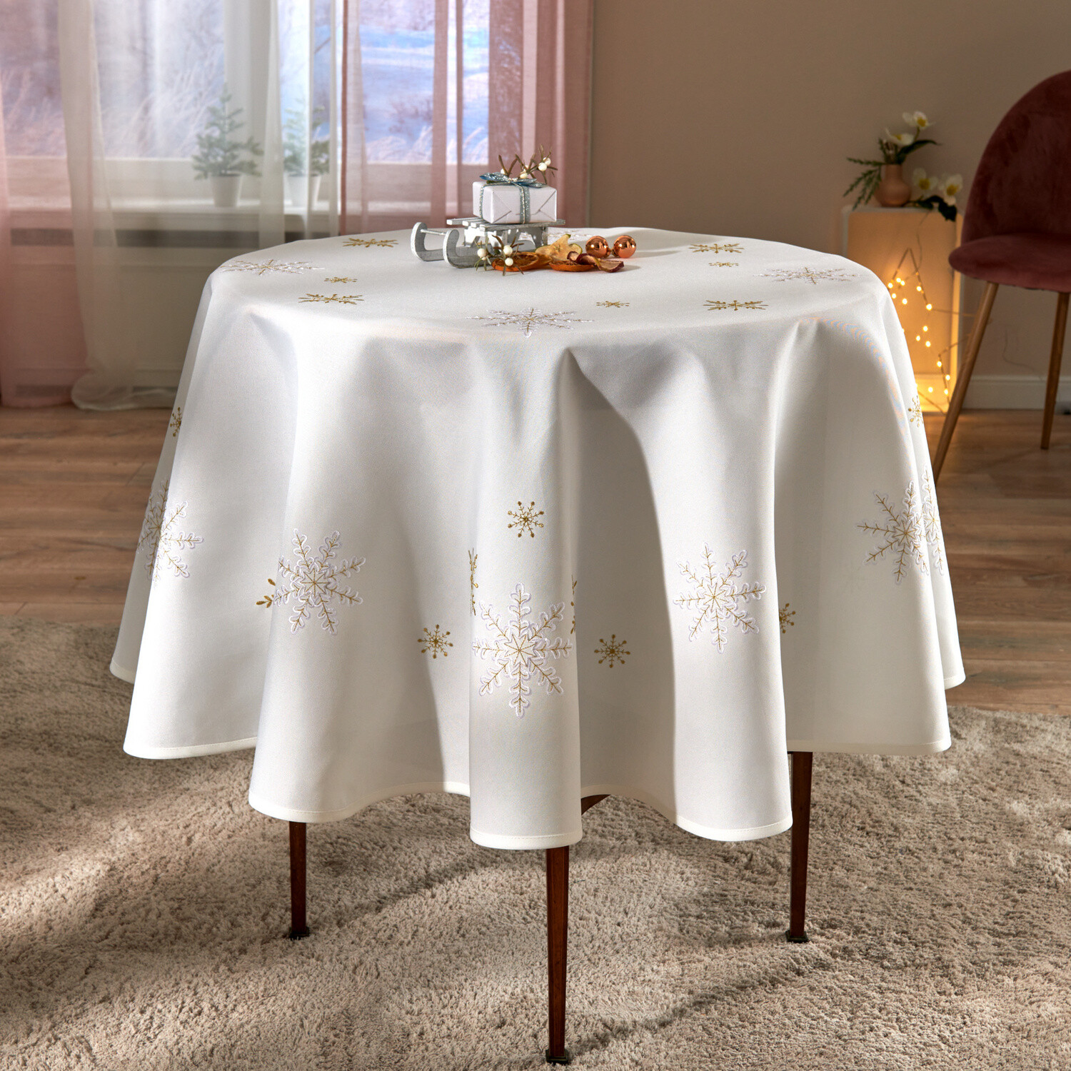 Sněhové vločky ve zlaté barvě na bílém podkladu - tyto ubrusy dodají slavnostní a elegantní vzhled. Vysoce kvalitní textilie s texturou. Propracovaná výšivka se sněhovými vločkami. S jemným zlatým leskem. Snadná údržba. Eldo.